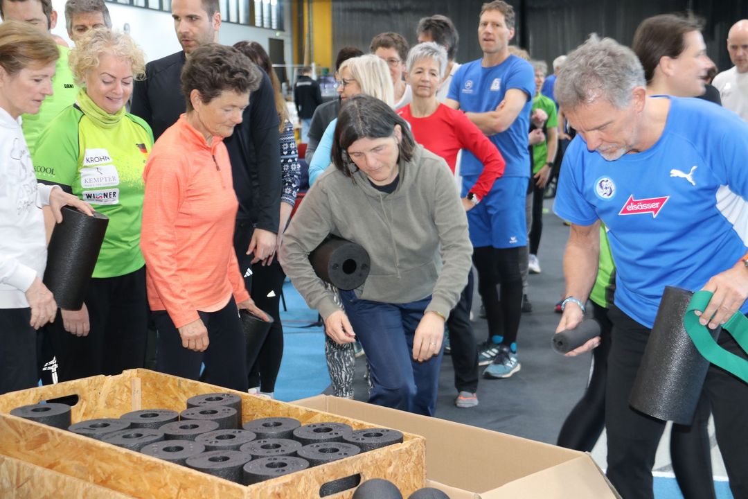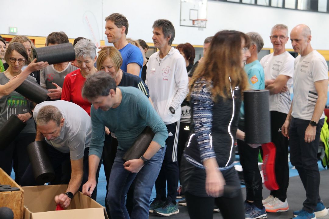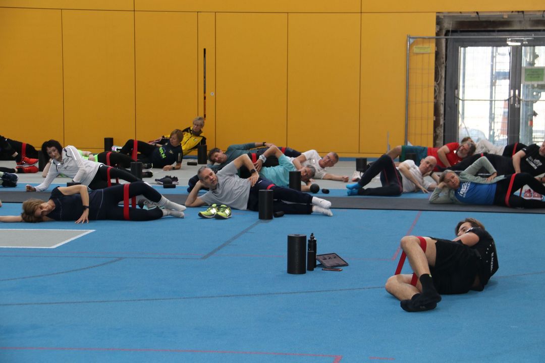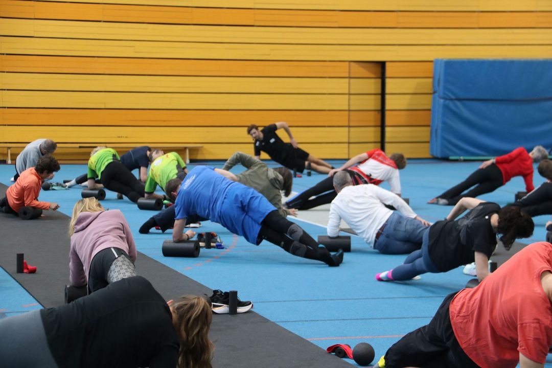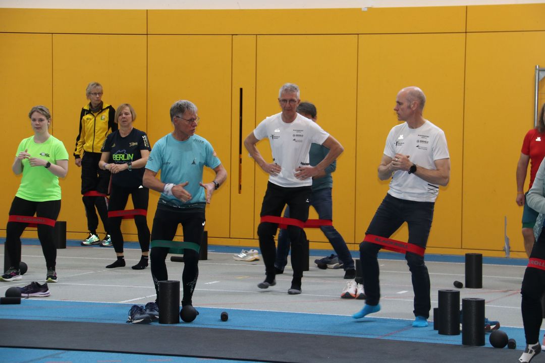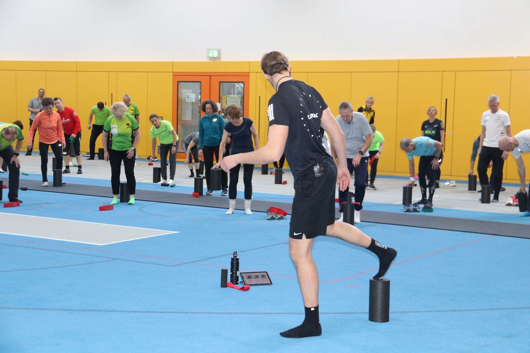 Der Nachmittag bot dann einen zweiten Workshopblock mit weiteren fünf Themen. Ob Nordic Walking zur Rückenstärkung, Trailrunning-Training im Flachland, Lauftechnik-Optimierung oder Ernährungstipps für Läufer:innen – für jede und jeden war etwas dabei. Ein besonders praxisnaher Workshop zur Beinachsenstabilisierung mit BLACKROLL rundete das Angebot ab.